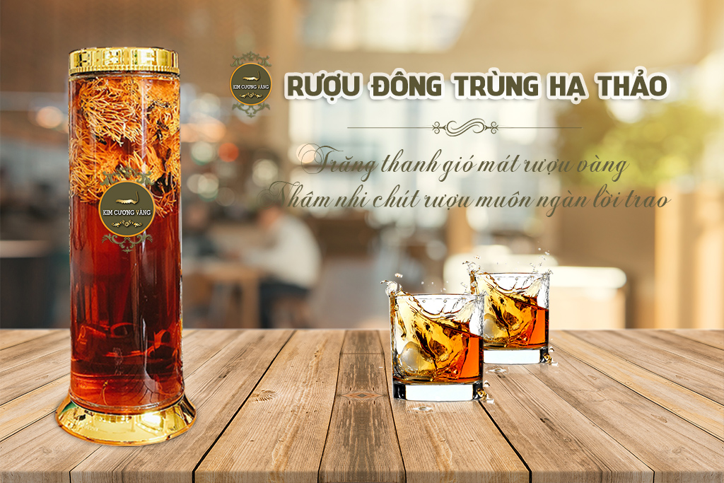 - Rượu Đông Trùng Hạ Thảo được ngâm từ 100% Đông trùng hạ thảo tươi nguyên chất Kim Cương Vàng